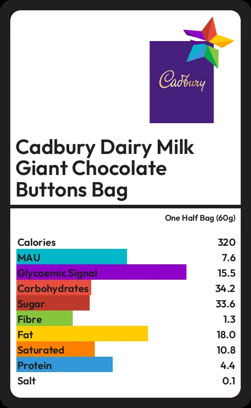 Cadbury Dairy Milk Giant Chocolate Buttons Bag contains 33.6g sugar in one Half Bag (60g) - that is around 8 cubes of sugar.