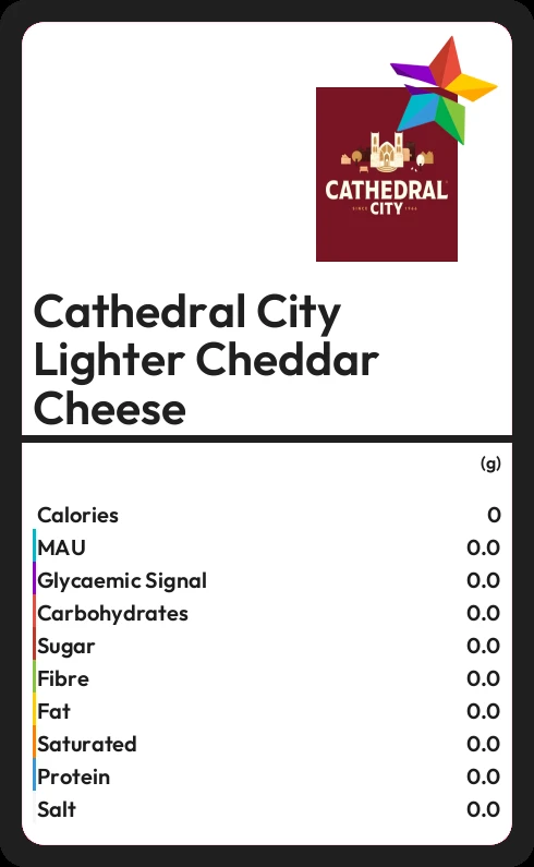 Cathedral City Lighter Cheddar Cheese contains 0.1g sugar in 100g