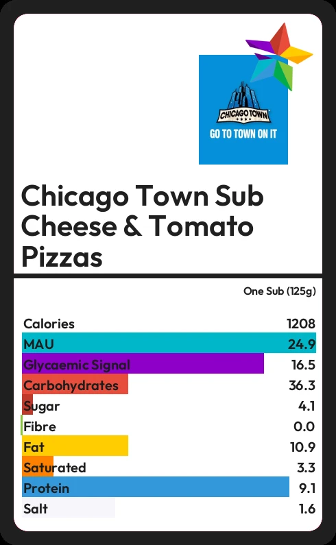 Chicago Town Sub Cheese & Tomato Pizzas contains 4.1g sugar in one Sub (125g) - that is around 1 cube of sugar.