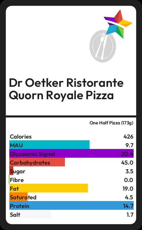 Dr Oetker Ristorante Quorn Royale Pizza contains 427.3 calories in one Half Pizza (173g).