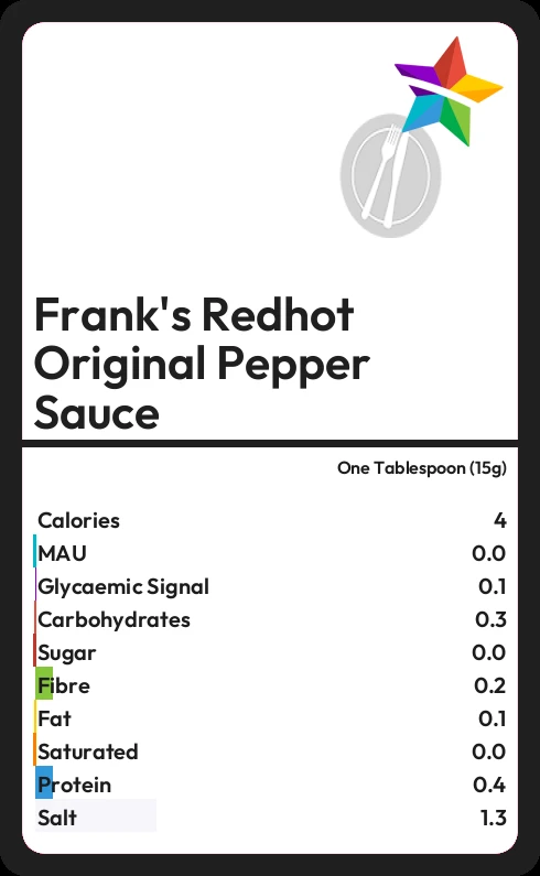 Frank's Redhot Original Pepper Sauce contains 3.9 calories in one Tablespoon (15g).