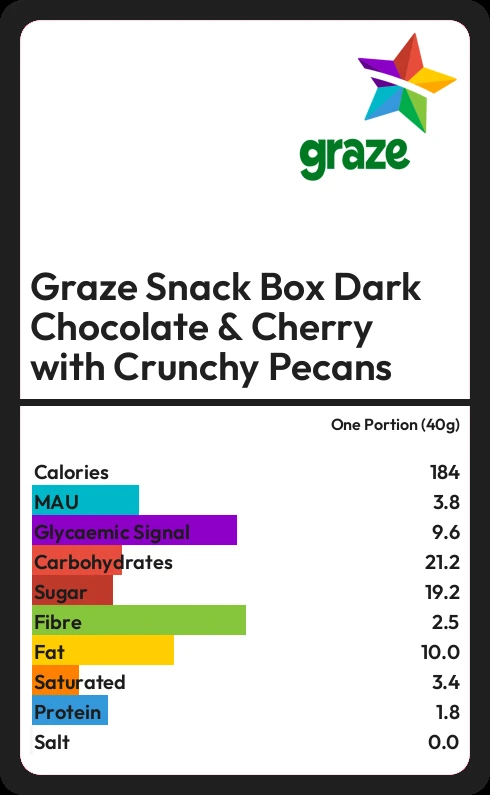 Graze Snack Box Dark Chocolate & Cherry with Crunchy Pecans contains 19.2g sugar in one Portion (40g) - that is around 5 cubes of sugar.