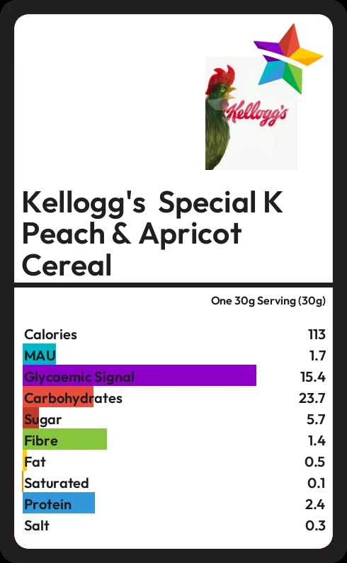 Kellogg's Special K Peach & Apricot Cereal contains 113.1 calories in one 30g Serving (30g).