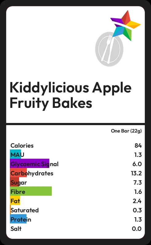 Kiddylicious Apple Fruity Bakes contains 83.8 calories in one Bar (22g).