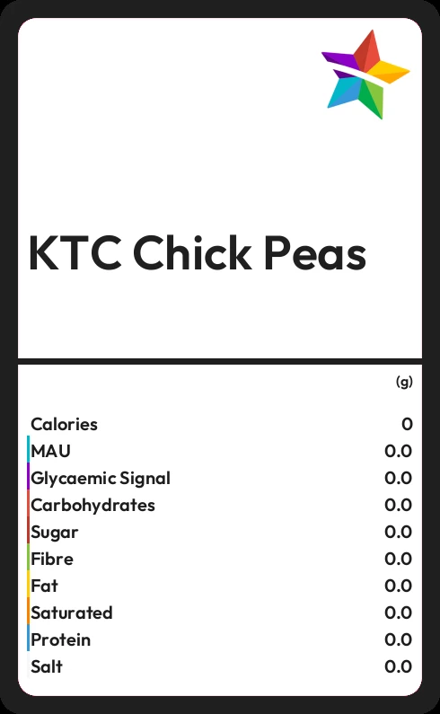 In 100g of KTC Chick Peas there are 1.3g of fat of which 0.1g are saturated.