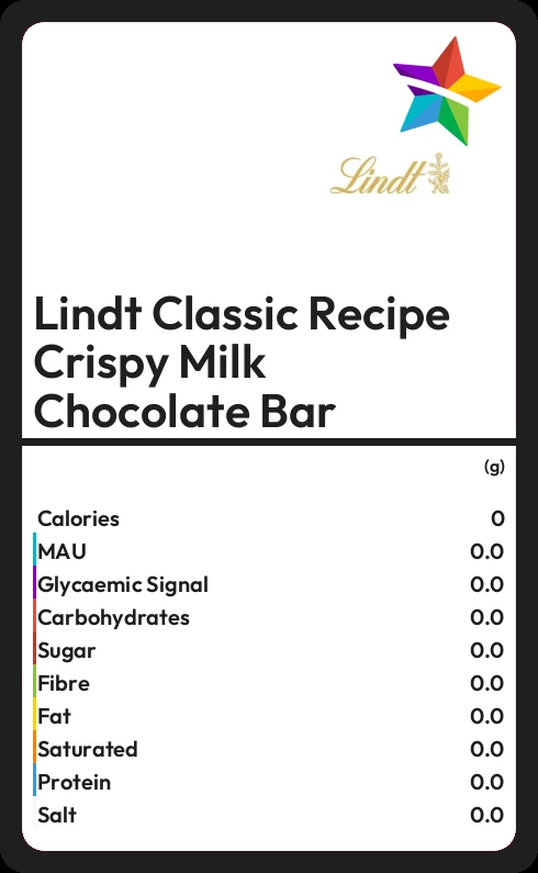 Lindt Classic Recipe Crispy Milk Chocolate Bar contains 51.0g sugar in 100g - that is around 13 cubes of sugar.