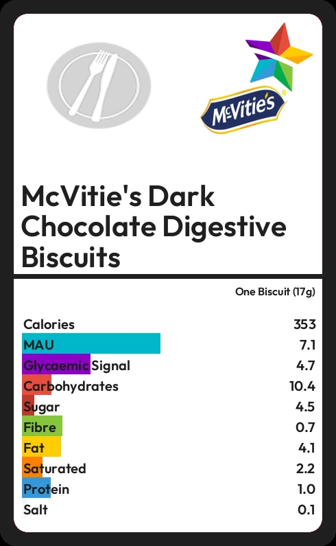 McVitie's Dark Chocolate Digestive Biscuits contains 353.1 calories in one Biscuit (17g).