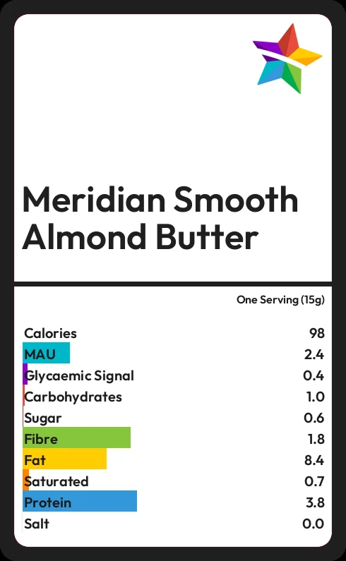 Meridian Smooth Almond Butter contains 0.6g sugar in one Serving (15g)