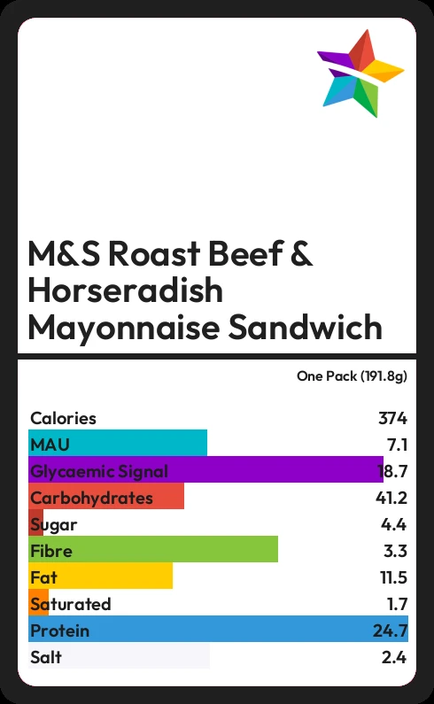 M&S Roast Beef & Horseradish Mayonnaise Sandwich contains 374 calories in one Pack (191.8g).