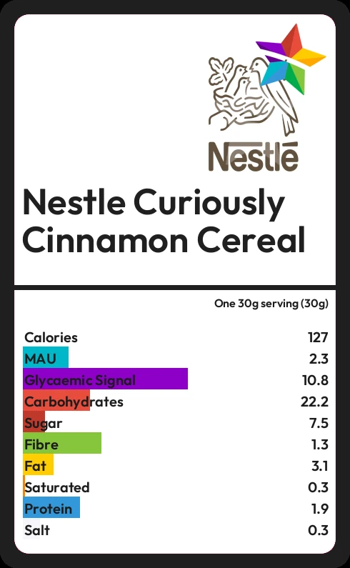 Nestle Curiously Cinnamon Cereal contains 7.5g sugar in one 30g serving (30g) - that is around 2 cubes of sugar.