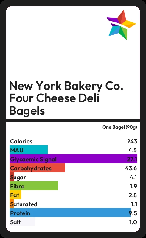 New York Bakery Co. Four Cheese Deli Bagels contains 4.1g sugar in one Bagel (90g) - that is around 1 cube of sugar.