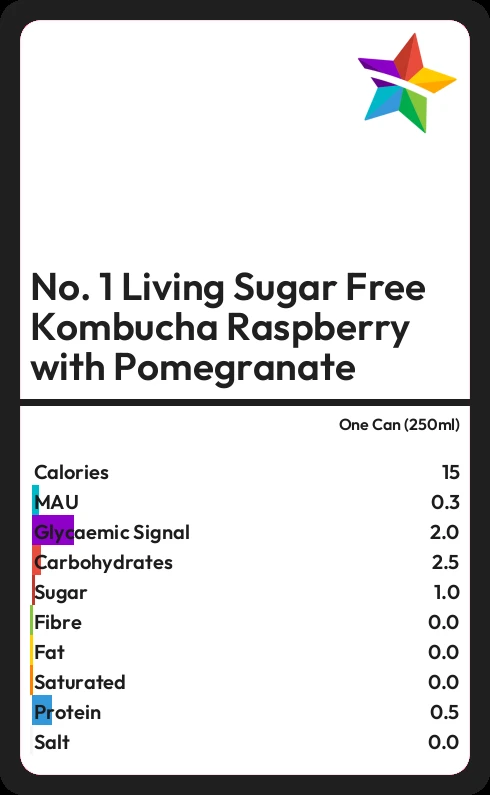 No. 1 Living Sugar Free Kombucha Raspberry with Pomegranate contains 15 calories in one Can (250ml).