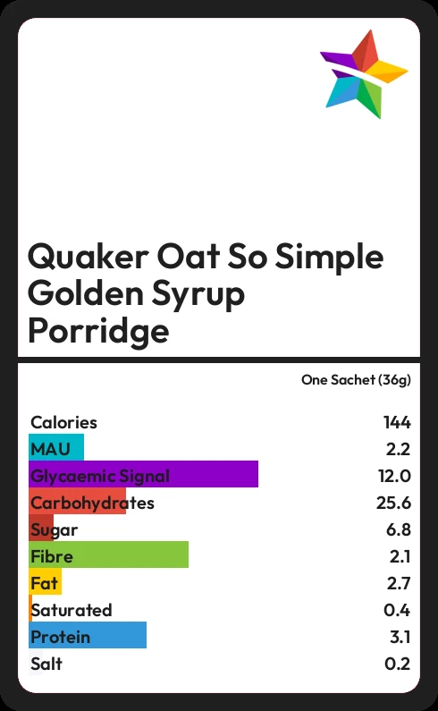 Quaker Oat So Simple Golden Syrup Porridge contains 144.4 calories in one Sachet (36g).
