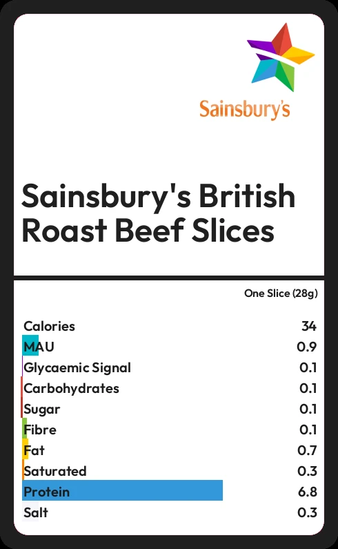 Sainsbury's British Roast Beef Slices contains 0.1g sugar in one Slice (28g)