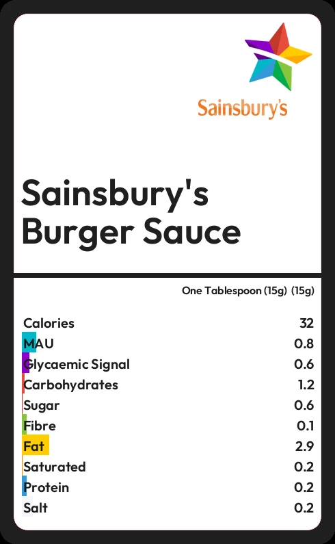 Sainsbury's Burger Sauce contains 31.7 calories in one Tablespoon (15g) (15g).