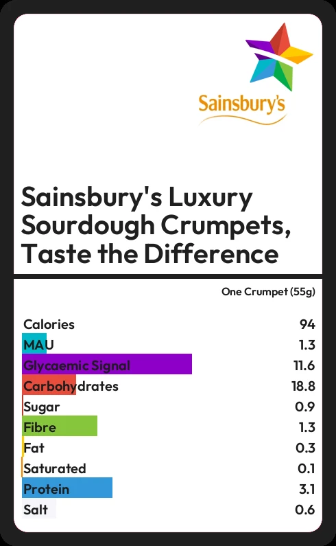 Sainsbury's Luxury Sourdough Crumpets, Taste the Difference contains 94.1 calories in one Crumpet (55g).