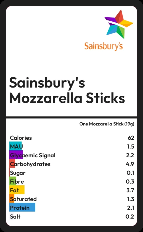 Sainsbury's Mozzarella Sticks contains 0.1g sugar in one Mozzarella Stick (19g)