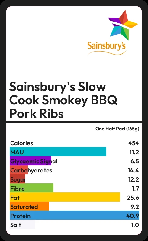 Sainsbury's Slow Cook Smokey BBQ Pork Ribs contains 453.8 calories in one Half Pacl (165g).