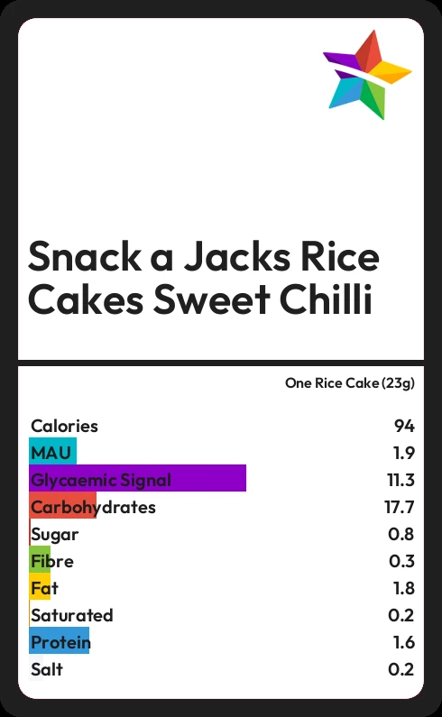 Snack a Jacks Rice Cakes Sweet Chilli contains 0.8g sugar in one Rice Cake (23g)