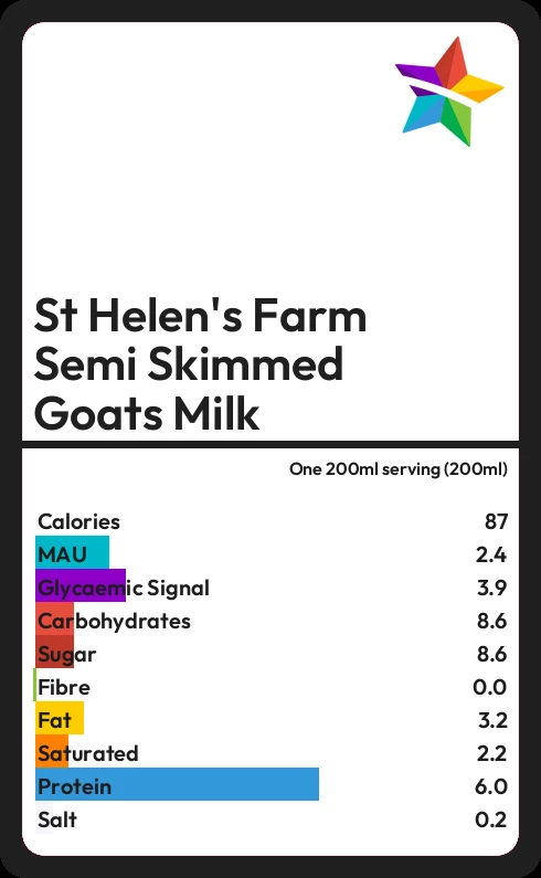 St Helen's Farm Semi Skimmed Goats Milk contains 88 calories in one 200ml serving (200ml).