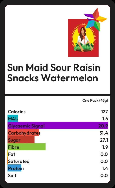 Sun Maid Sour Raisin Snacks Watermelon contains 27.1g sugar in one Pack (43g) - that is around 7 cubes of sugar.