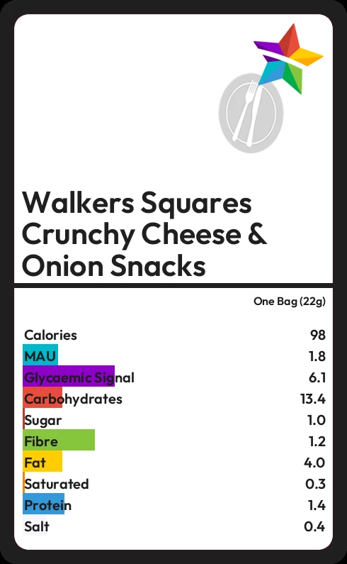 Walkers Squares Crunchy Cheese & Onion Snacks contains 1.0g sugar in one Bag (22g)