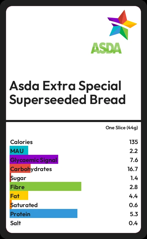 Asda Extra Special Superseeded Bread contains 1.4g sugar in one Slice (44g)