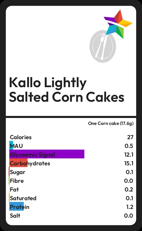 Kallo Lightly Salted Corn Cakes contains 0.1g sugar in one Corn cake (17.6g)