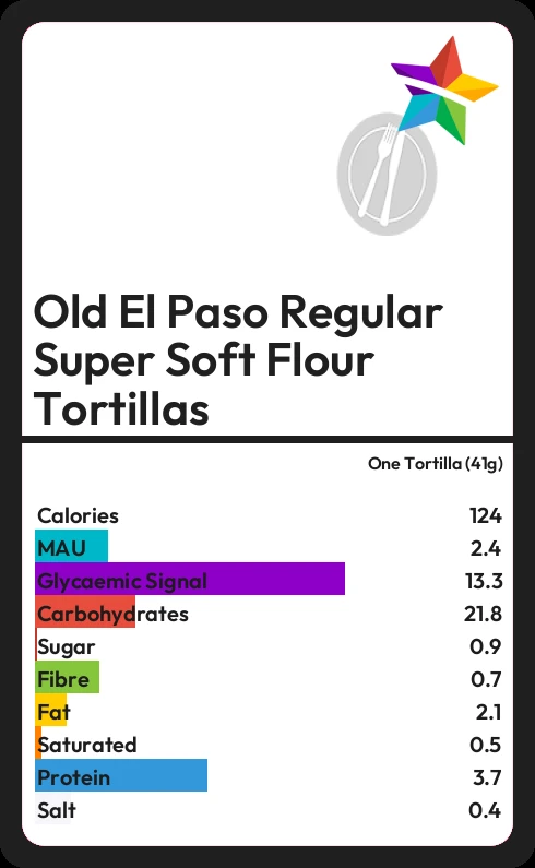 Old El Paso Regular Super Soft Flour Tortillas contains 0.9g sugar in one Tortilla (41g)