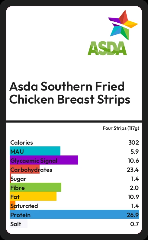 Asda Southern Fried Chicken Breast Strips contains 301.9 calories in four Strips (117g).